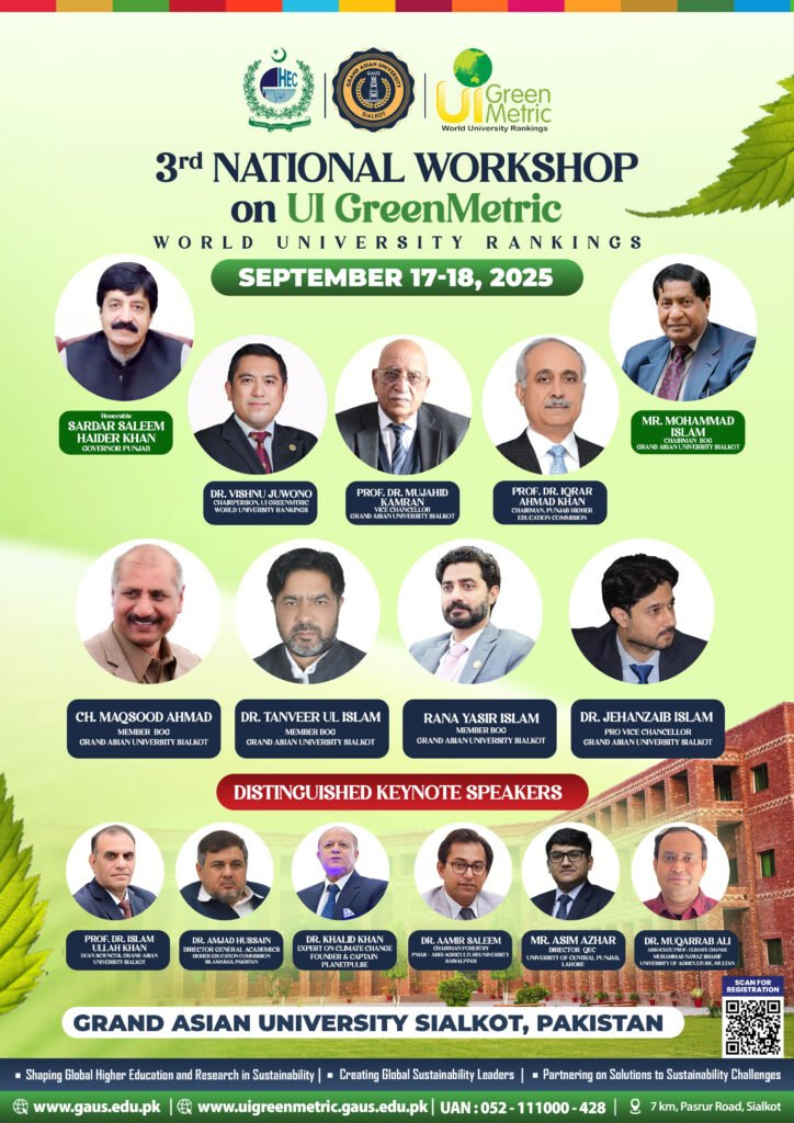 Grand Asian University Sialkot (GAUS) proudly announce hosting of 3rd National Workshop on UI GreenMetric World University Ranking for Universities in Pakistan 2025.